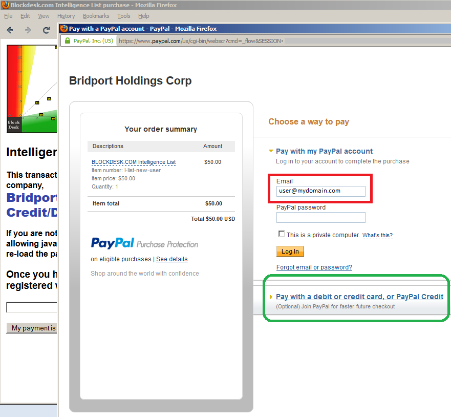 PayPal OR Credit Card payment: You can elect to use a Credit Card (see green oval below), or pay via your PayPal account. Please note the email address involved with this step will be required in the next step as well. If you are working from a desktop computer,